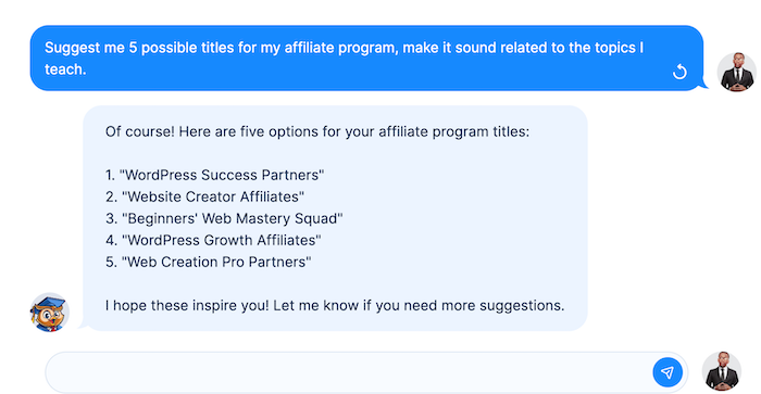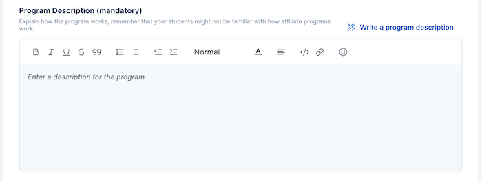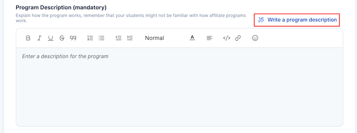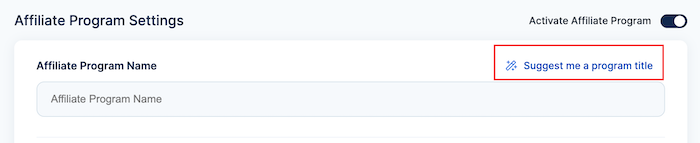 1. Affiliate Program Name: Here, you choose a title that represents your brand and courses. If you struggle to come up with one, you could use the "suggest me a program title" AI assistant