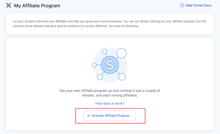 - Activate your Affiliate Program by clicking the appropriate button.
