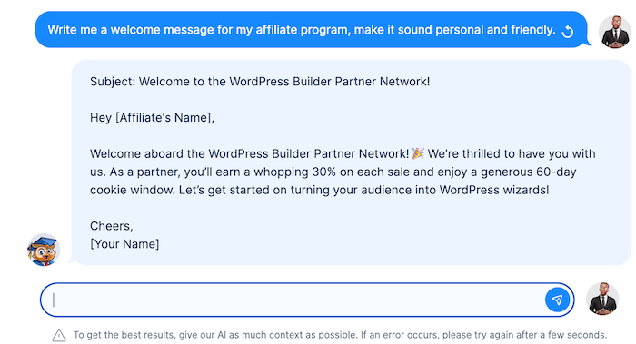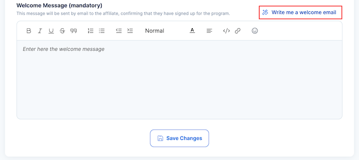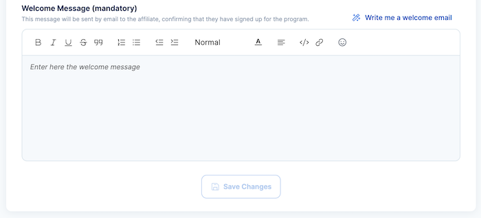 5. Welcome Message: Here, you are required to craft a message that will be sent to new affiliates upon signup. You should use this to set expectations and provide initial guidance.