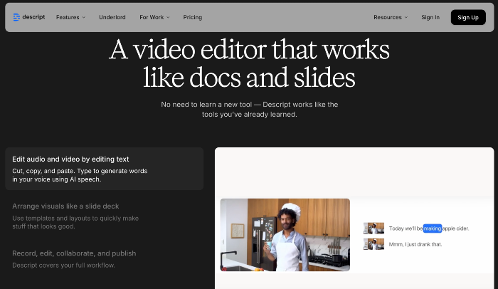 - Descript: Easy video editing like a Word document.