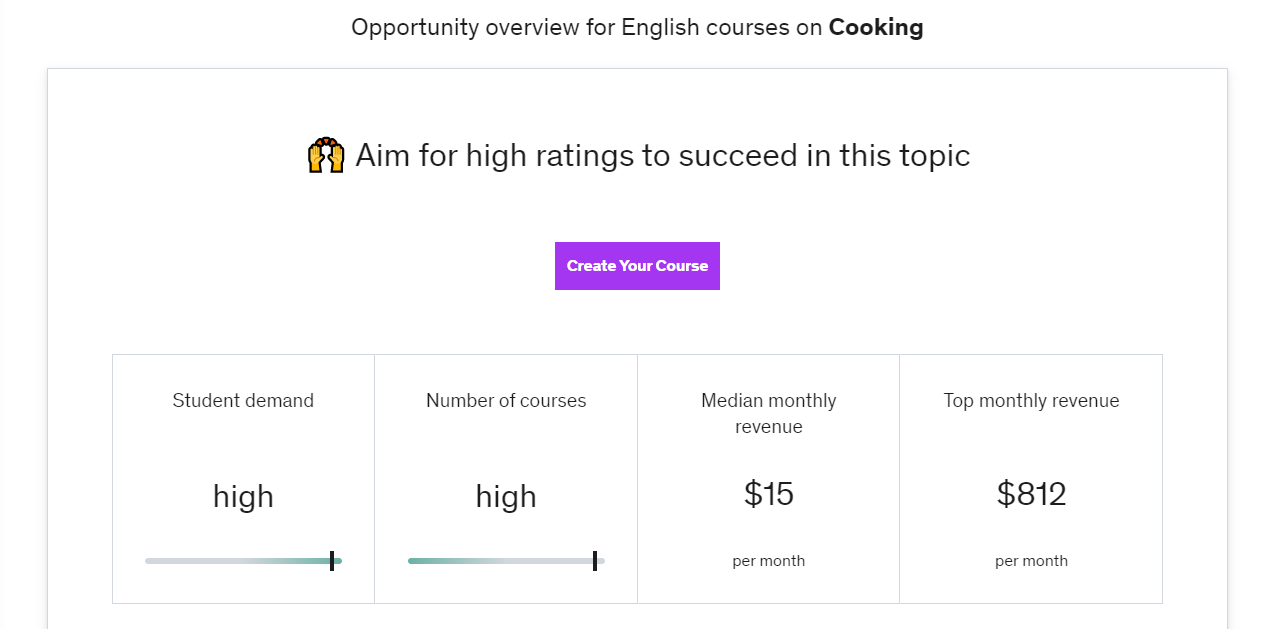 Though according to the Udemy marketsight tool, cooking isn't as lucrative as the other niches we have reviewed so far. But there is high student demand. There is a possibility that the niche will attract more revenue in the future.