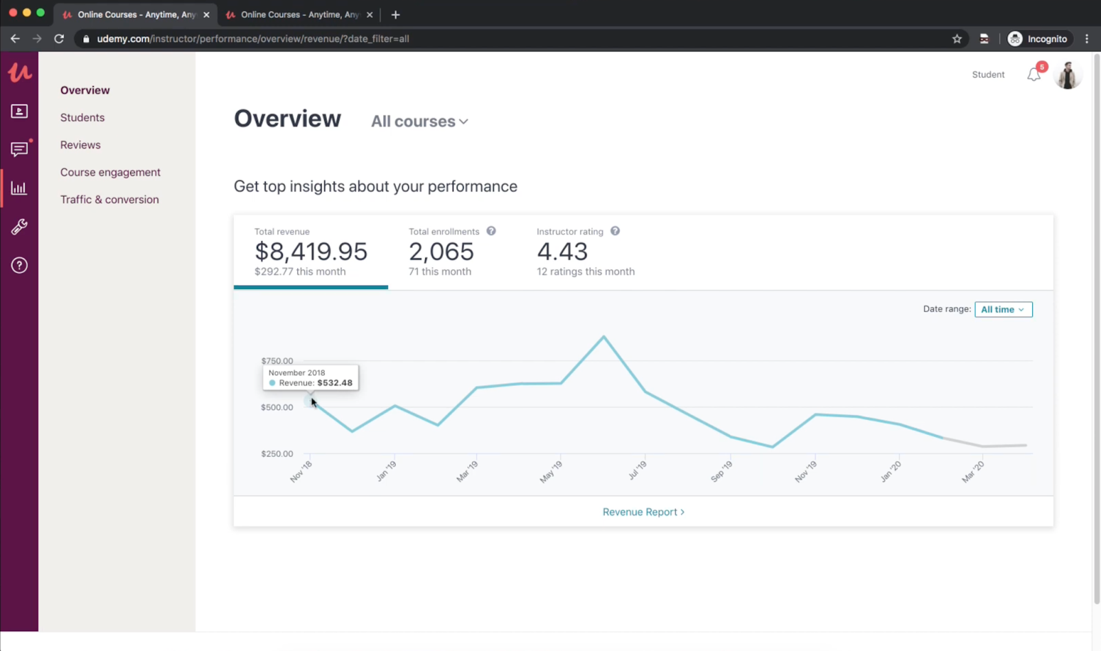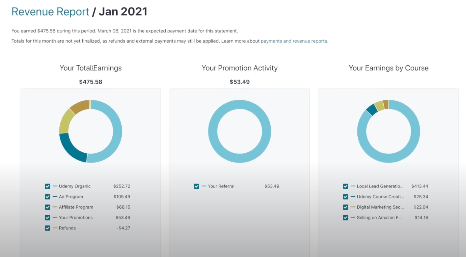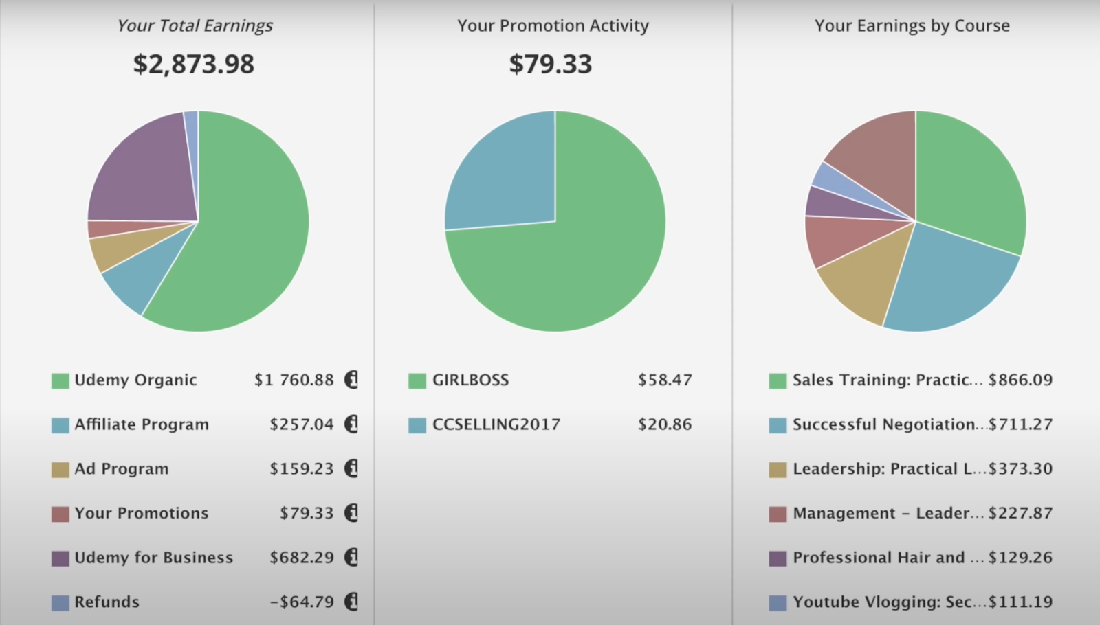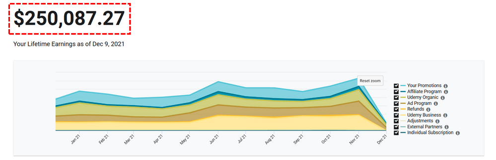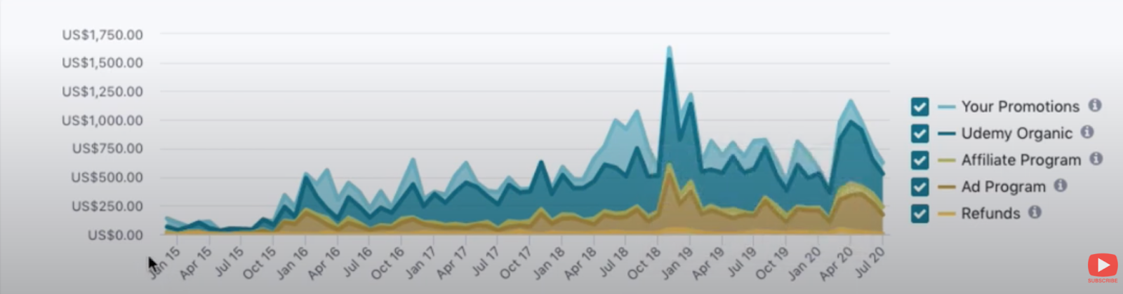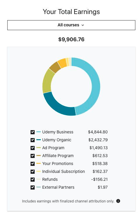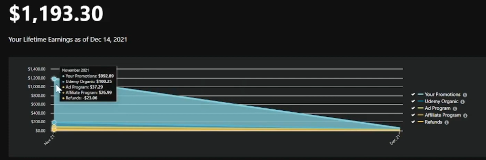 This example from Fabian provides an overview of his total earnings on Udemy after being on the platform for eighteen months.