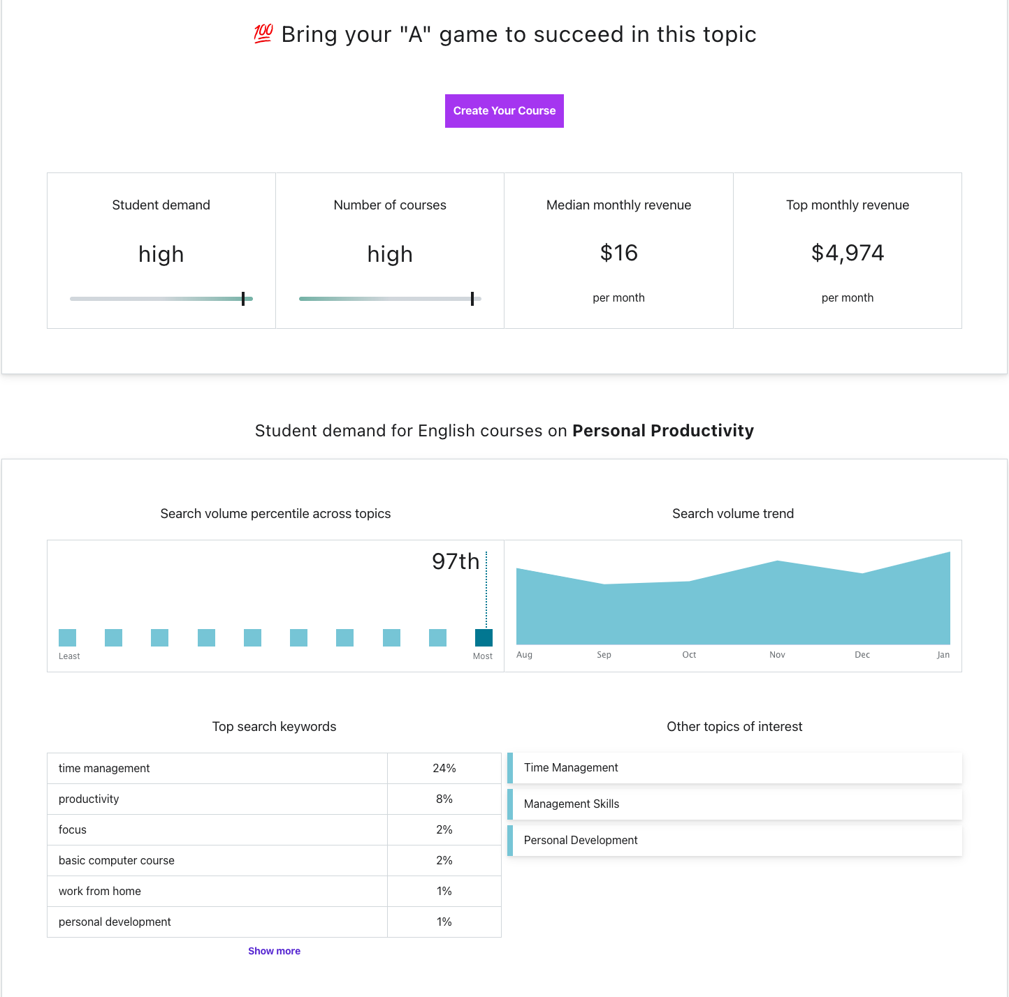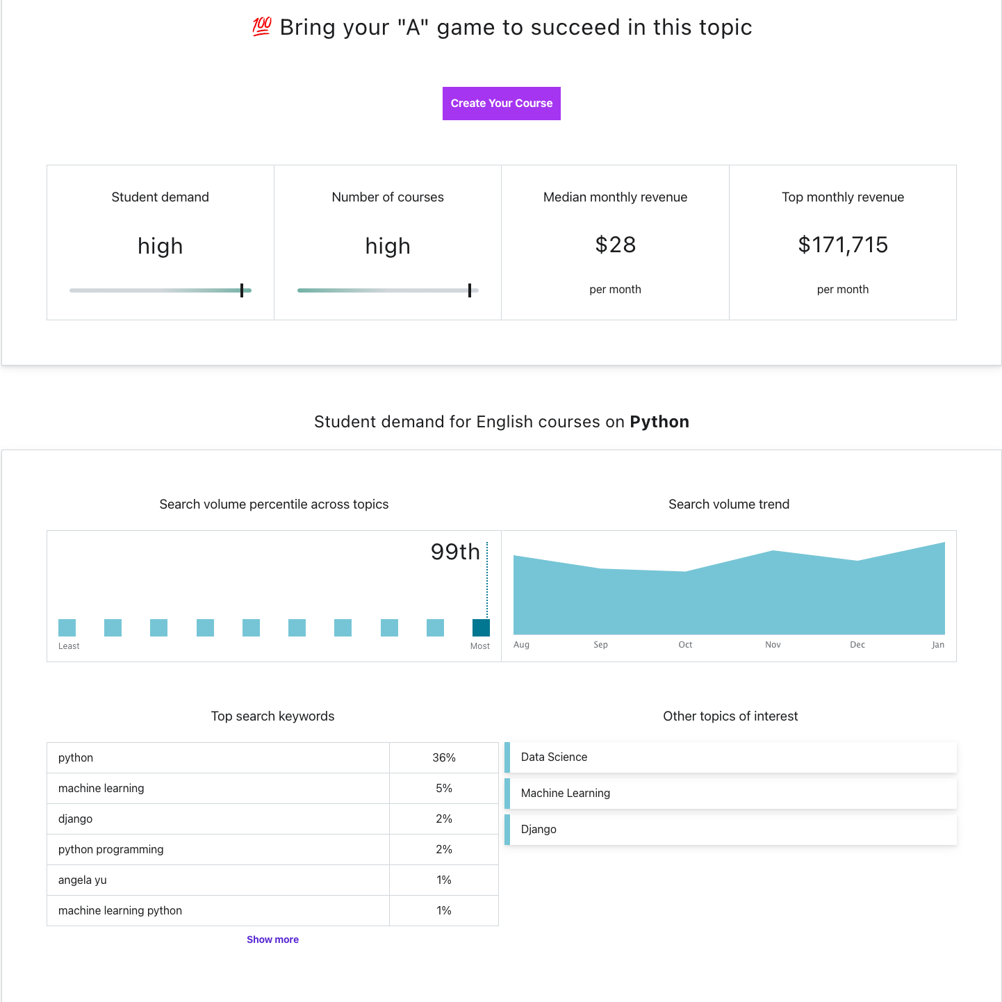 You can have an idea of the potential revenue of your course category on Udemy by using some of their free tools.