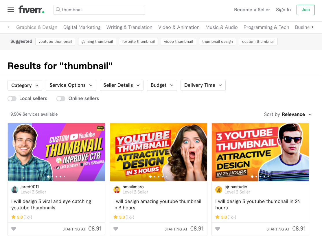 If you don't have experience hiring freelancers online, we recommend that you simply use the platform fiverr.com, and order your first thumbnail from there.