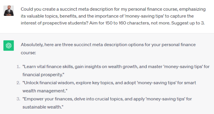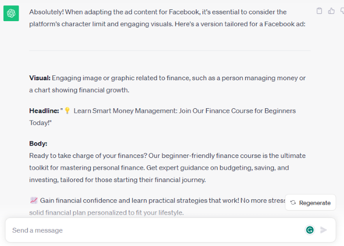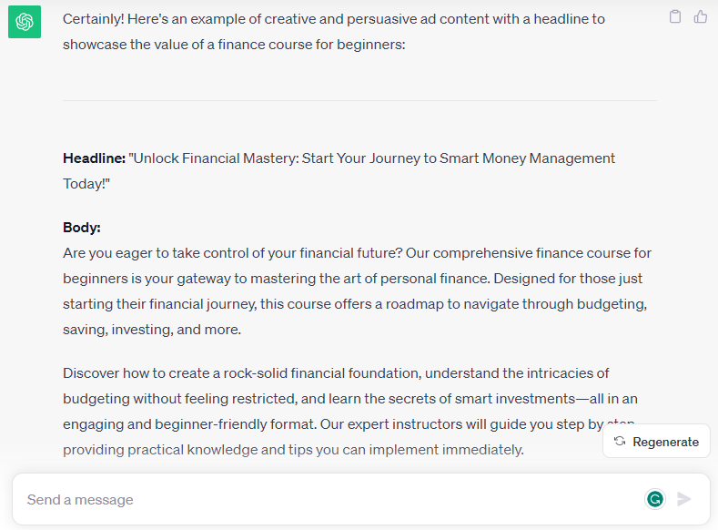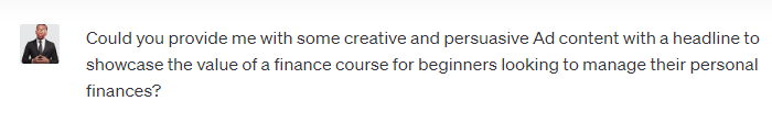 Imagine you want an eye-catching headline and Ad content for your course in personal finance. You can ask ChatGPT this: