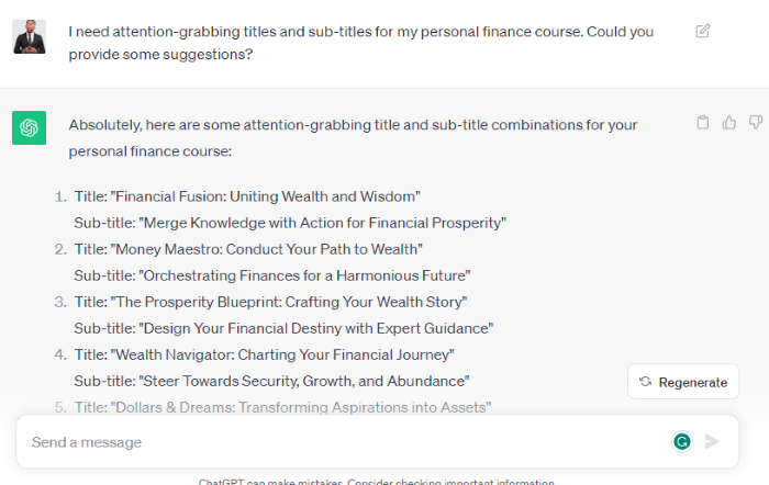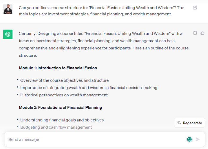 For the sake of this post, let's continue with the example of the personal finance course to show how ChatGPT can guide you in crafting a well-structured course outline.