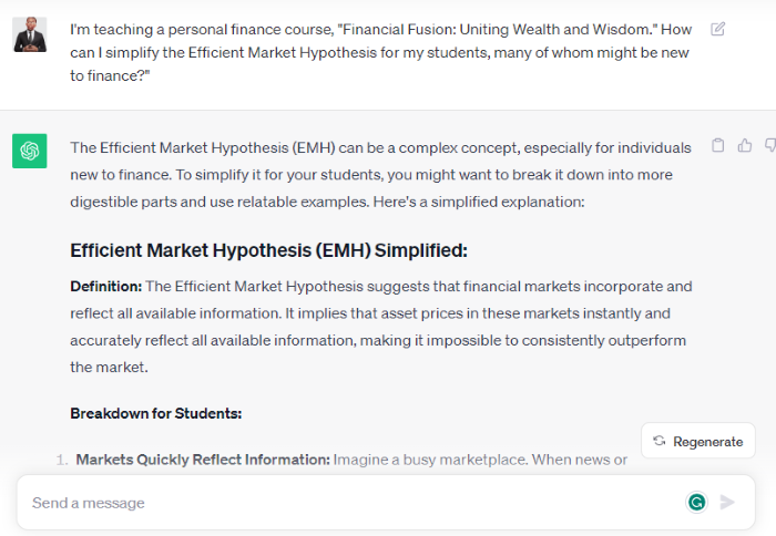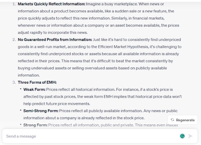 With this ChatGPT response, you can see how complex financial concepts like the Efficient Market Hypothesis can be simplified.