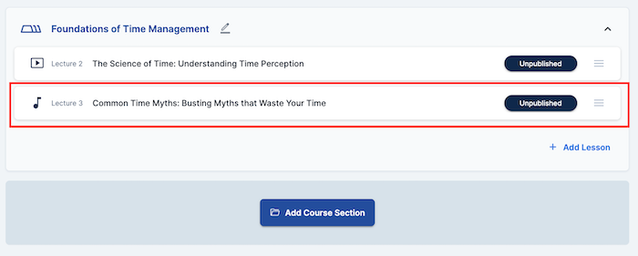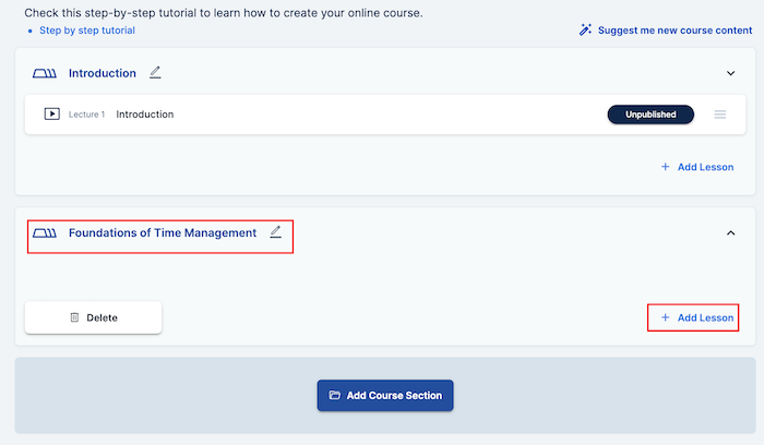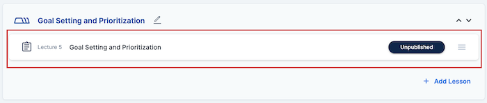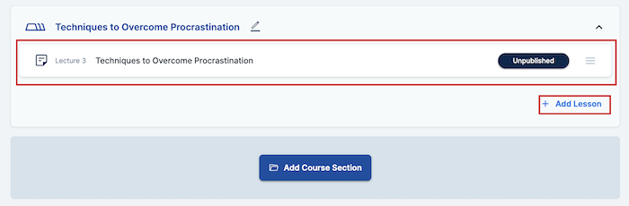 You'll see the new course section as shown in the image below. Next, you'll need to add lessons to the new section. Click on "Add Lesson".
