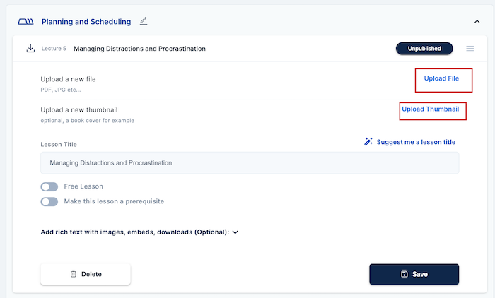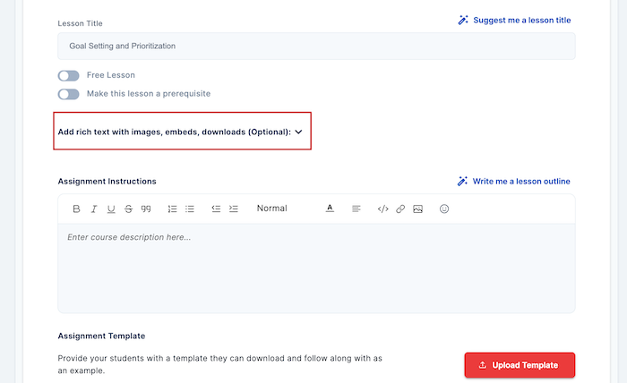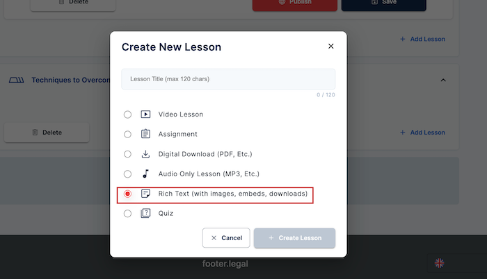 The Online Course Builder also allows you to add Rich Text to your lesson. To do this, click + Add Lesson and choose "Rich Text (with images, embeds, downloads".