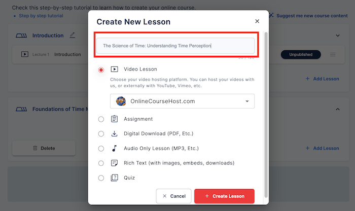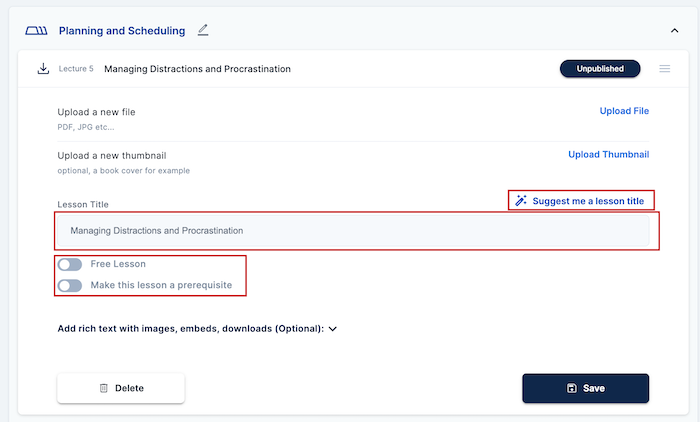 Don't forget to enter the title of the digital download lesson. Also, if you need help determining the title, use the "Suggest me a lesson title" AI assistant.
