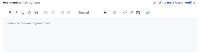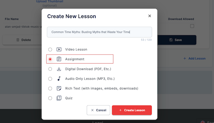 To do this, click on + Add Lesson and choose "Assignment". Don't forget to add the Assignment title with a maximum of 120 characters. Then, click on "+Create Lesson".