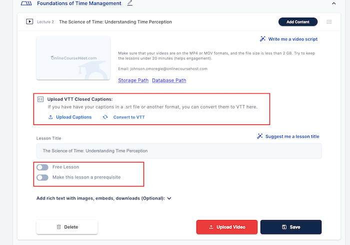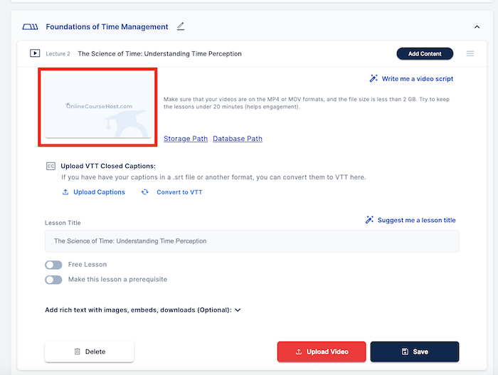 You can also make your video a free lesson or a prerequisite by toggling the buttons.