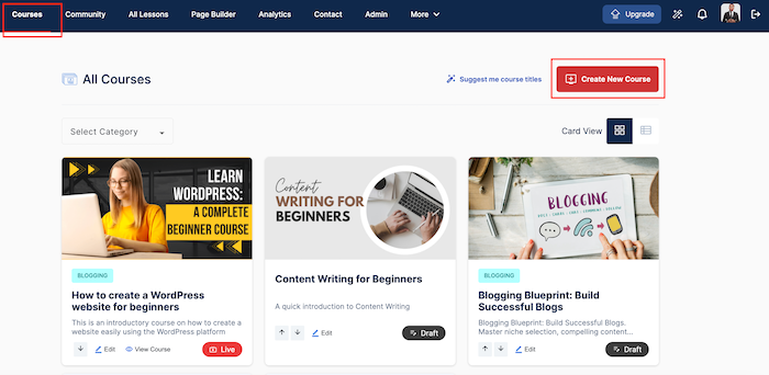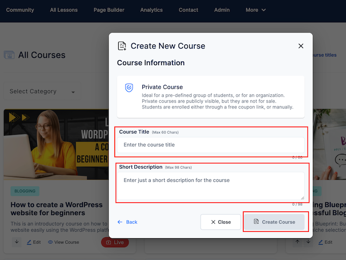 To create a private course, you have to follow the same steps as creating a "Premium Course". Click on "Courses" then "Create New Course"