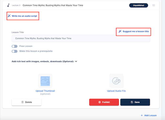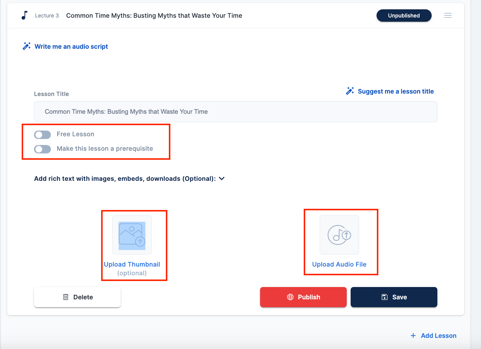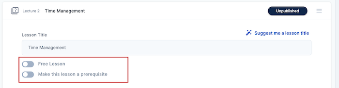 Like the video lesson, the course builder also allows you to set your audio lesson as a "Free Lesson" and a "Prerequisite". Depending on your choice, toggle the options as shown in the image below.