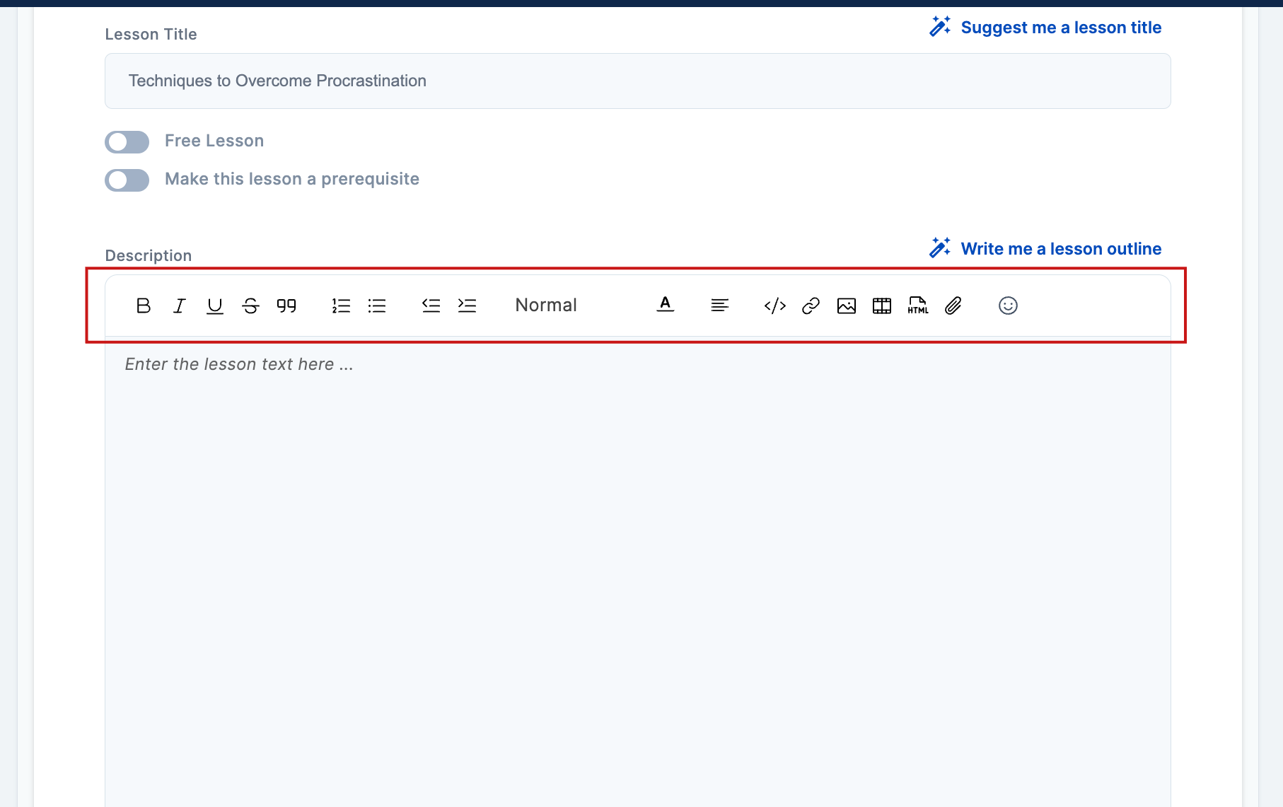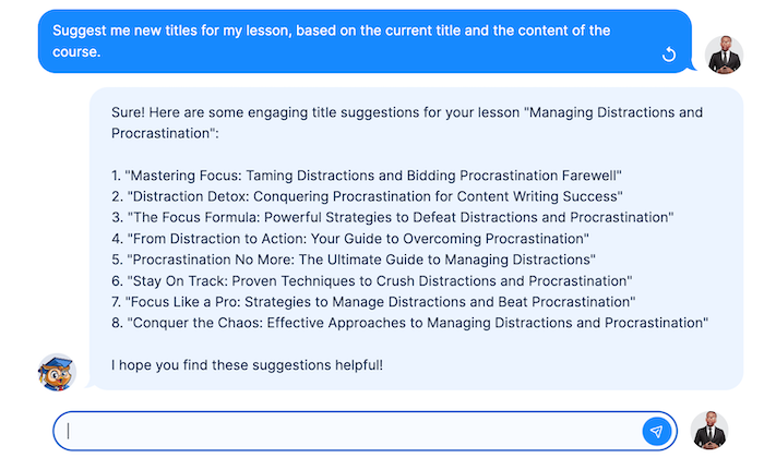 Also, the"Suggest me a lesson title" AI assistant, can help you to suggest a convincing title for your lesson.
