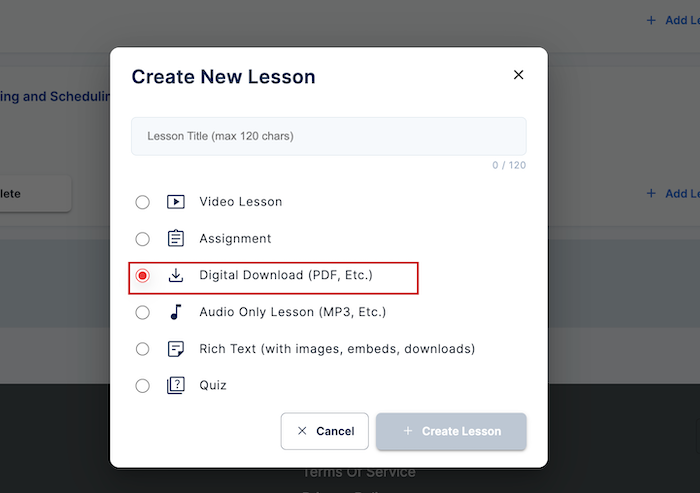 To start, click on + Add Lesson and select "Quiz". Ensure you enter a title for your digital download, keeping it under 120 characters. Then, click "Create Lesson".