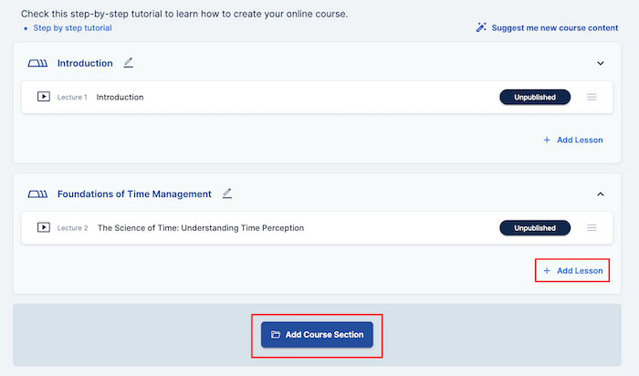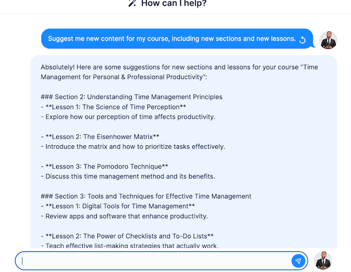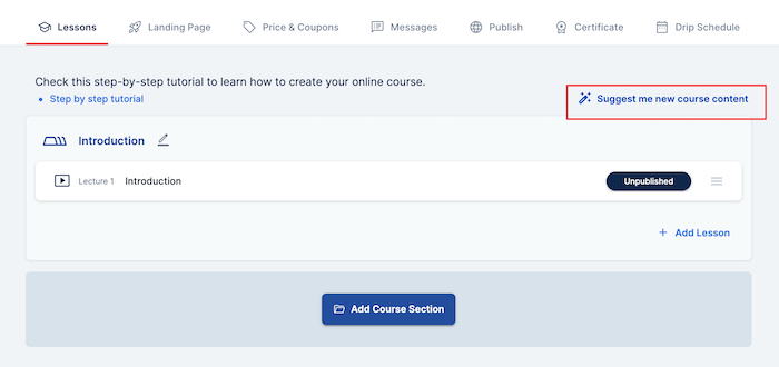 The AI will then suggest new course sections and lessons based on your online course title, which you can edit to your taste.