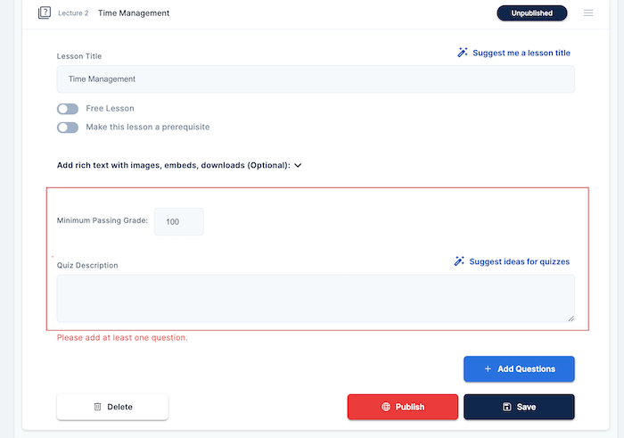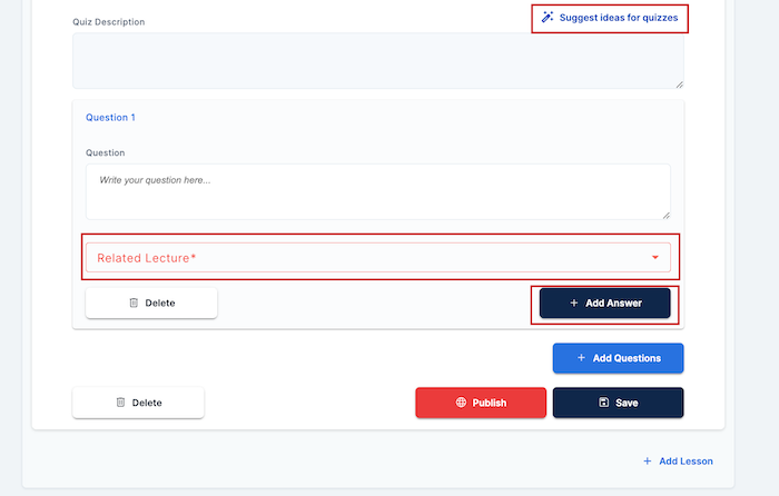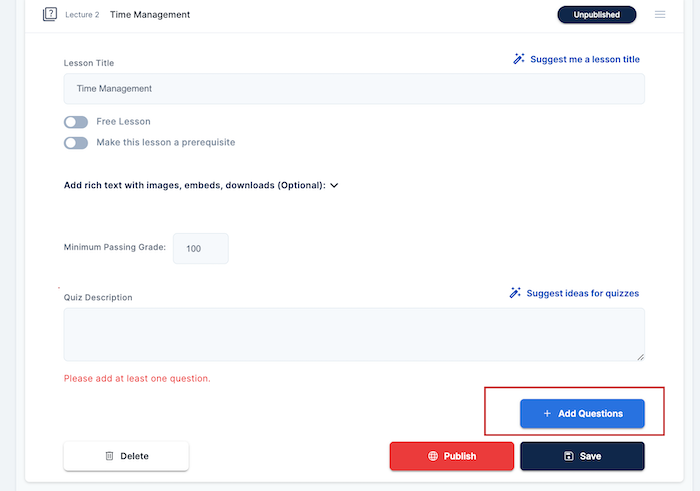 Click the + Add Questions" to start adding questions, and choose a related lesson.