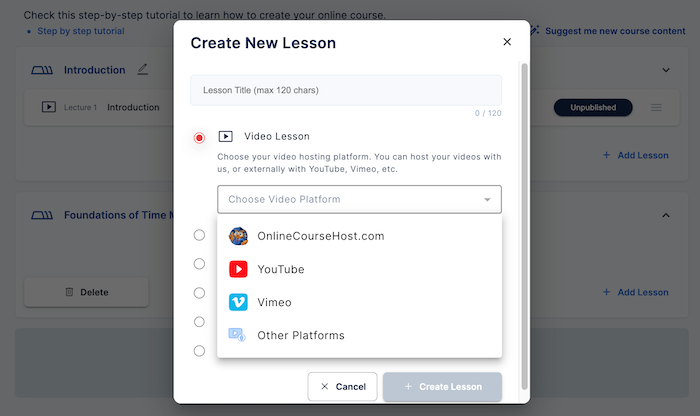 You can choose among OnlineCourseHost (The same platform I am using the course builder), YouTube, Vimeo, or Other platforms.