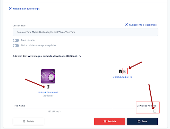 The course builder also provides options to delete uploaded audio and images if you need to change them. You can allow your students to download your audio lesson by checking "Download Allowed".
