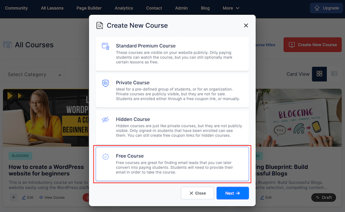 To create a Hidden Course, click on the "Courses" menu then "Create New Course". Choose "Free Course".