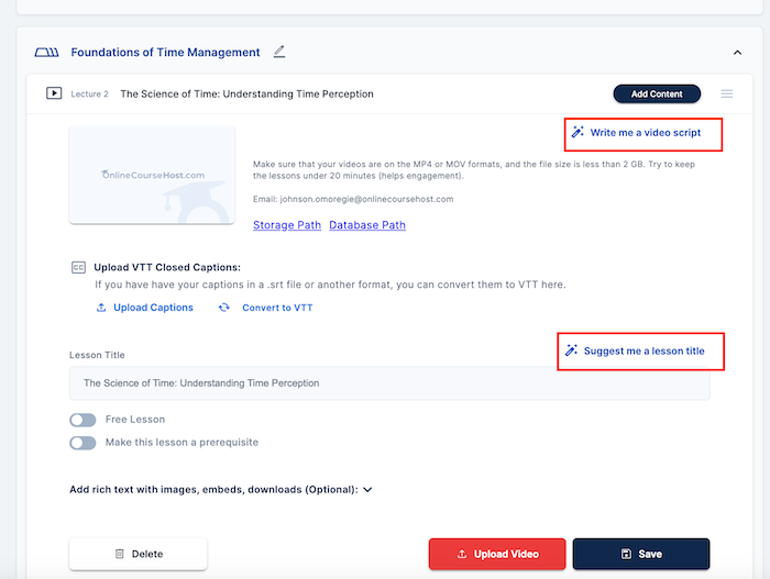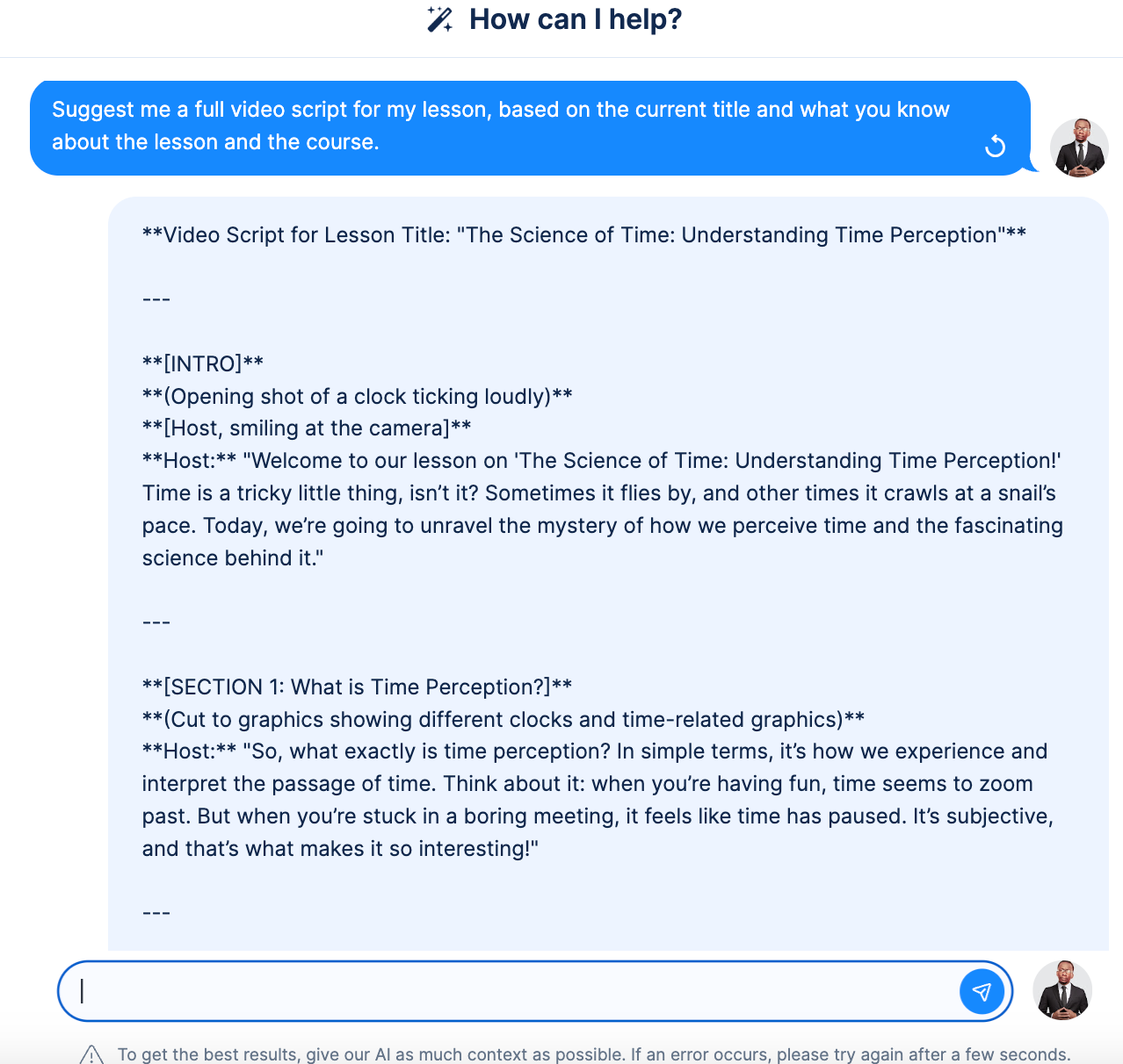 Note that you can use the "Write me a video script" AI assistant to help you write your video lesson script.