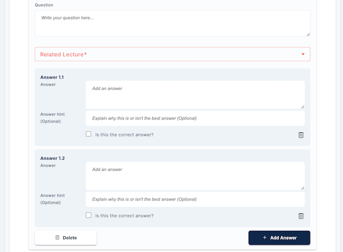 - Repeat "Add Answer" for more choices (minimum 2). Use the bin icon to delete unwanted answers.