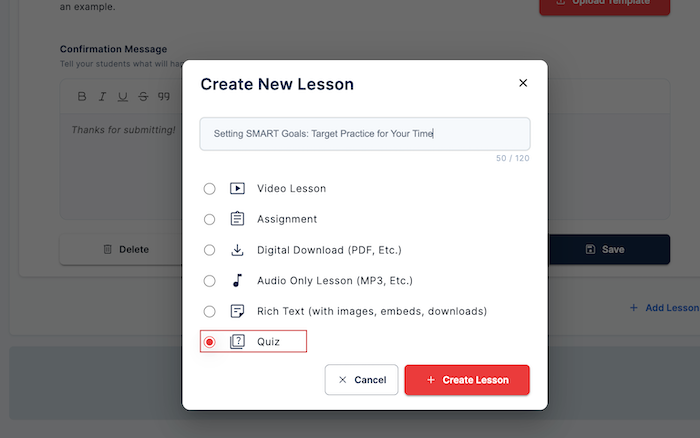 To start, click on + Add Lesson and select "Quiz". Be sure to enter a title for the quiz, keeping it under 120 characters. Then, click "Create Lesson".