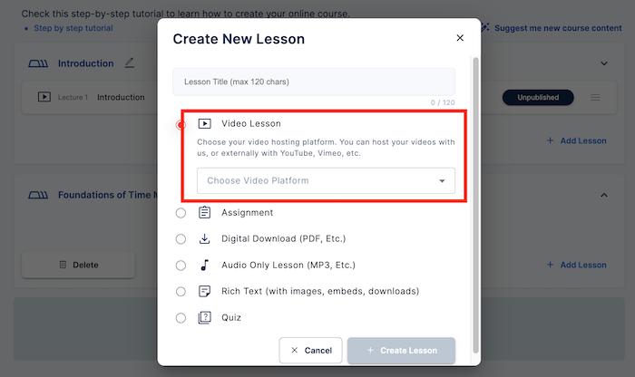After creating your video lesson, choose where to upload it by selecting the video platform.