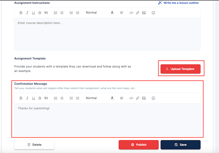 Also, you can set the confirmation message your students will receive once they are done with their assignment and submit it.
