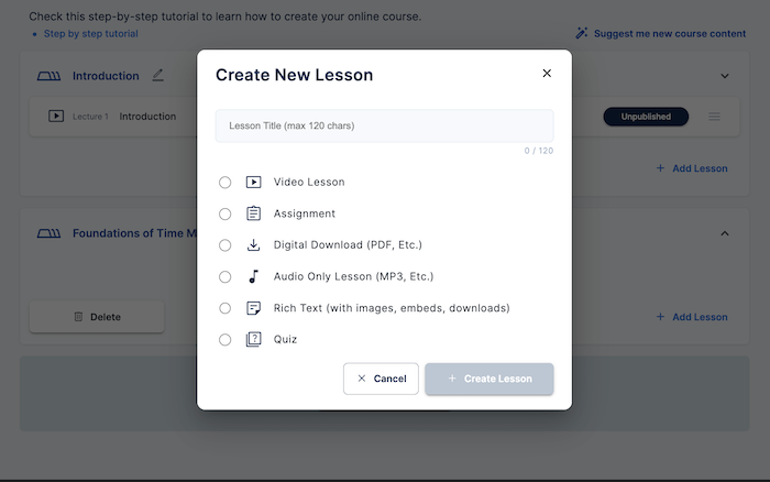 - We walked through the process of creating various lesson types: video, audio, rich text, quizzes, assignments, and digital downloads.