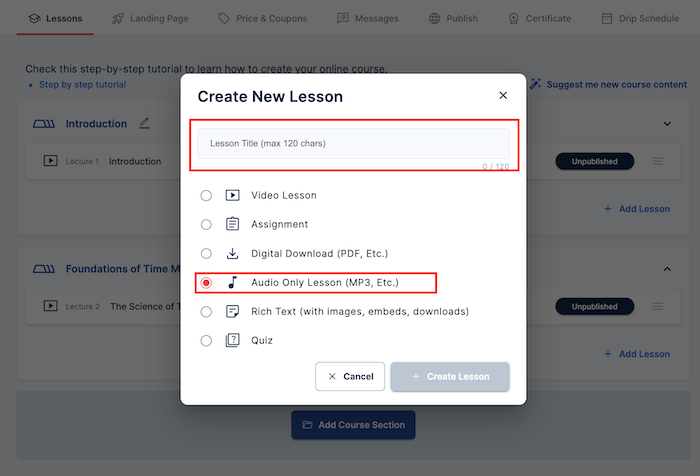 To do this, click on + Add Lesson and choose "Audio Only Lesson (MPS, Etc.)". Don't forget to add the lesson title with a maximum of 120 characters.