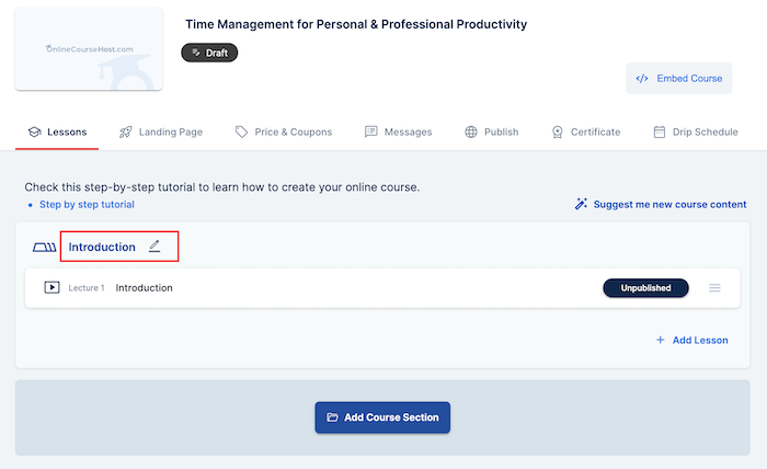 Click on "Introduction" to edit your course introduction title section if you want to.