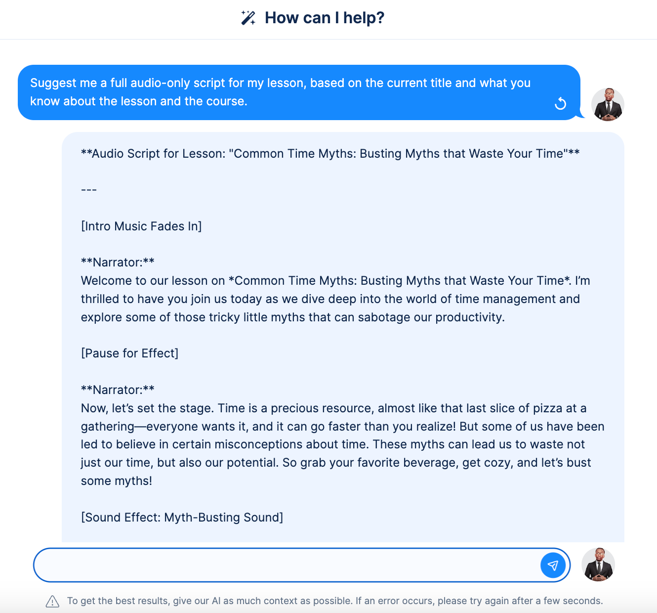 The Course builder also provides AI assistance if you need help writing your audio script or lesson title.