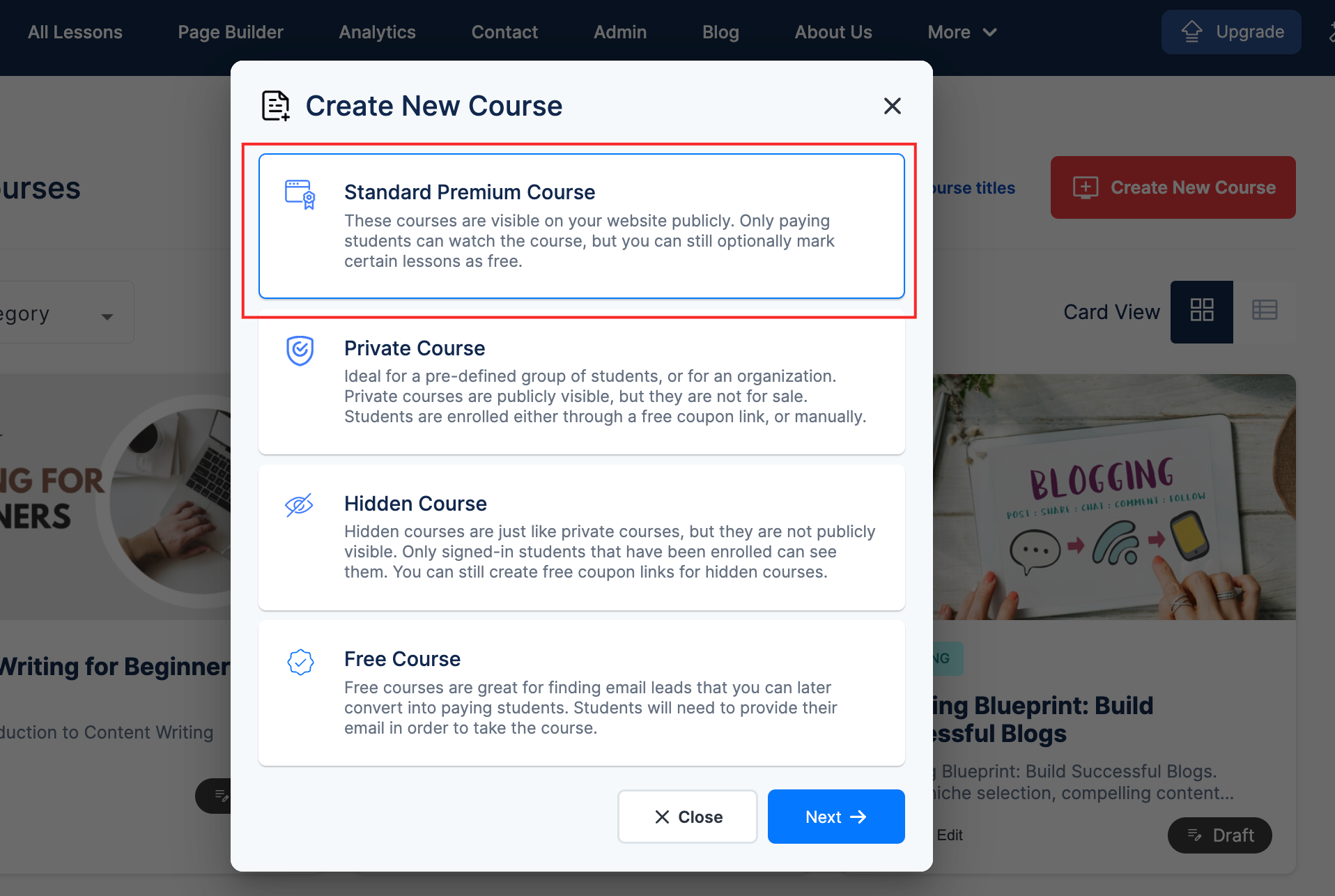 1. Standard Premium Courses: These courses are publicly visible and available for anyone to buy. You can: