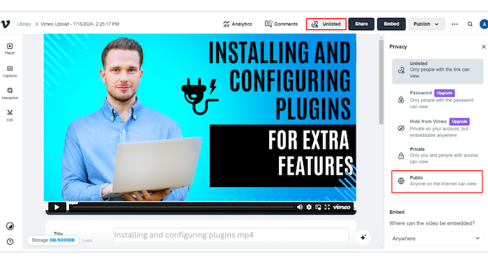 - Make the Video Public: If your video is set to "Unlisted" or private, change its settings to "Public" by clicking "Unlisted" in the top-right corner and selecting "Public." This step ensures your video is accessible for embedding.