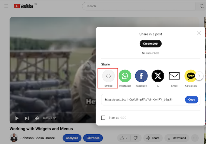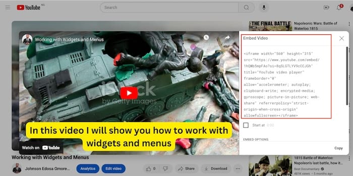 - Get the Embed Code: You can copy the embed code of the video from the right-hand side of the screen as shown in the image below.