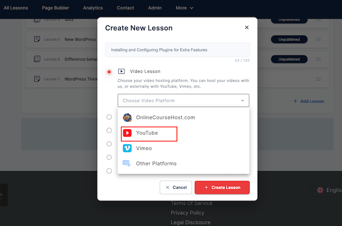 - Click on "Choose Video Platform", and select "YouTube from the drop-down list. Then, "+ Create Lesson."