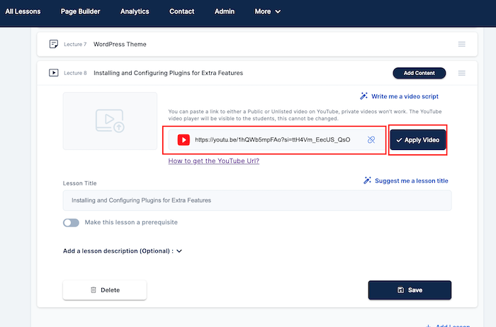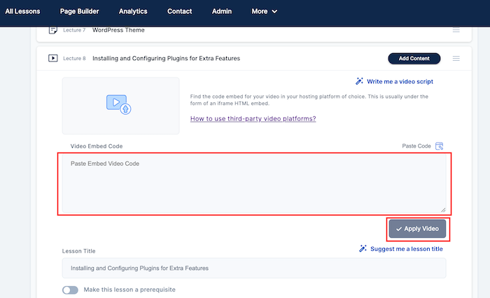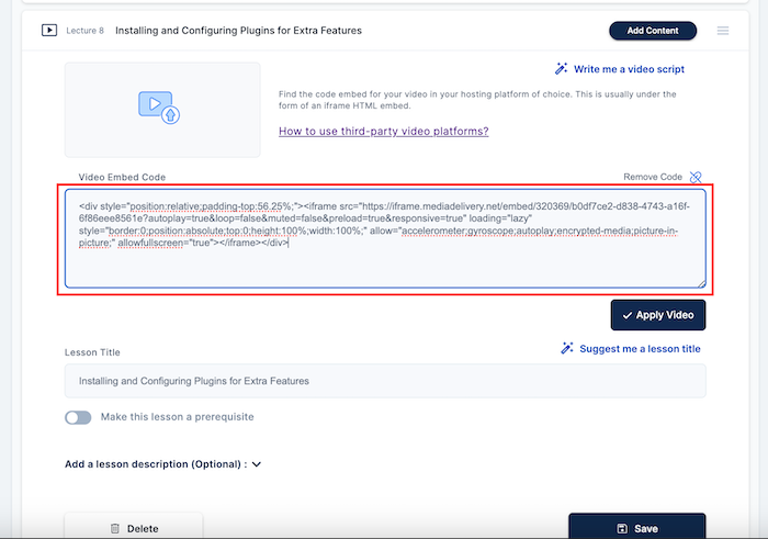 - Paste the URL: Insert the URL into your course platform’s video lesson section, and click on "Apply Video."