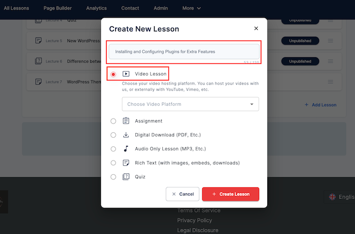 - Type in the title of your lesson and choose "video" as shown below and type in the lesson title