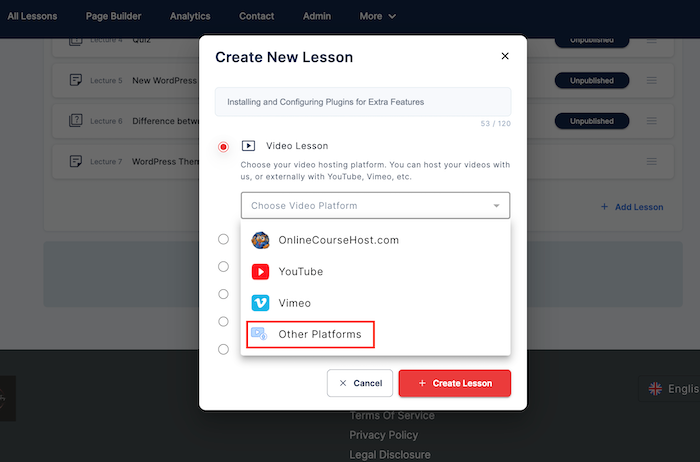 - Click on "Choose Video Platform", and select "Other Platforms" from the drop-down list. Then, "+ Create Lesson."
