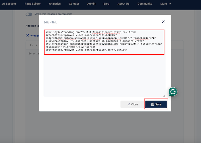 These same steps apply to pasting video lesson embed codes from Loom, Wistia, and other platforms.