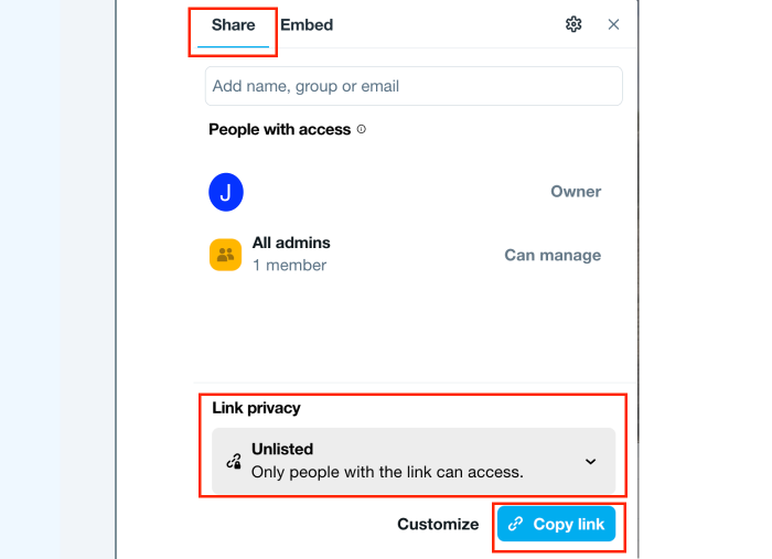 - Change the "Link privacy" to "Unlisted."