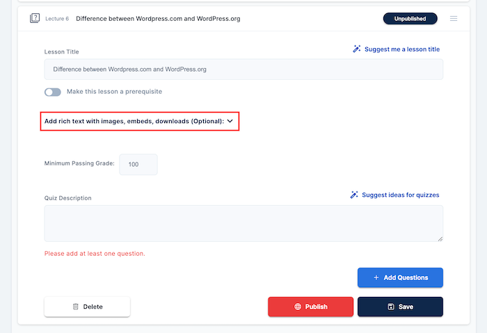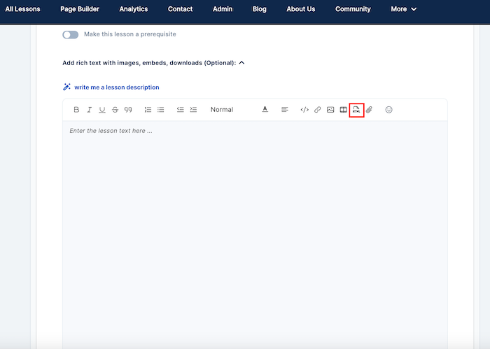 - Once you open the lesson, scroll down and click on "Add rich text with images, embeds, downloads (Optional)"