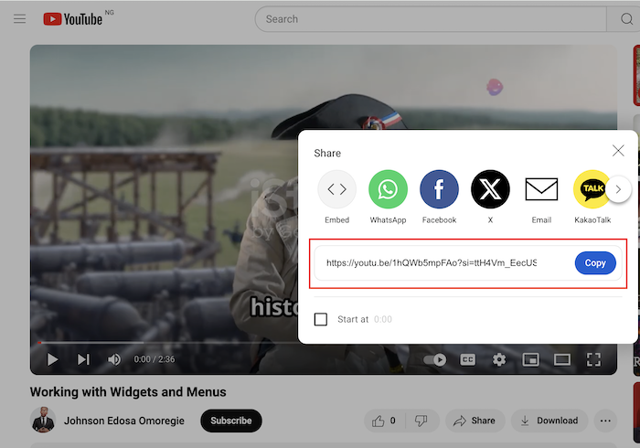 - Copy the YouTube URL. (Refer to the previous section for instructions on how to get the video URL).