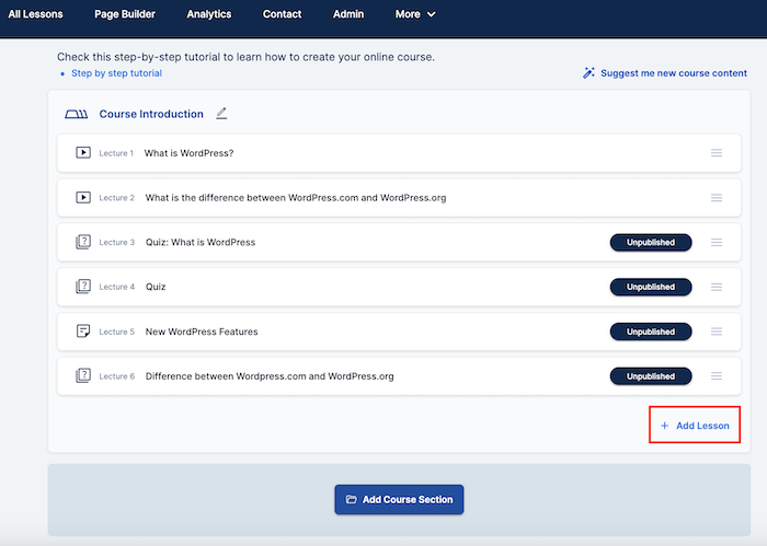 - Scroll down and click on "+Add Lesson".