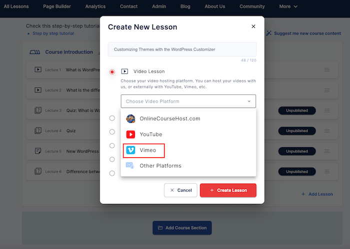 - Select "Vimeo" from the drop-down list, then "+ Create Lesson."