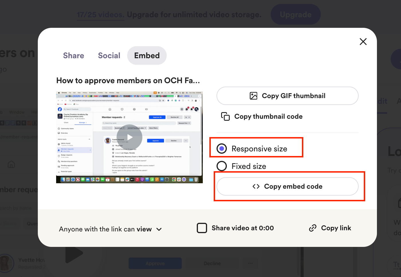 - Click on "Embed," then "Copy embed code" to copy the code of your course video.