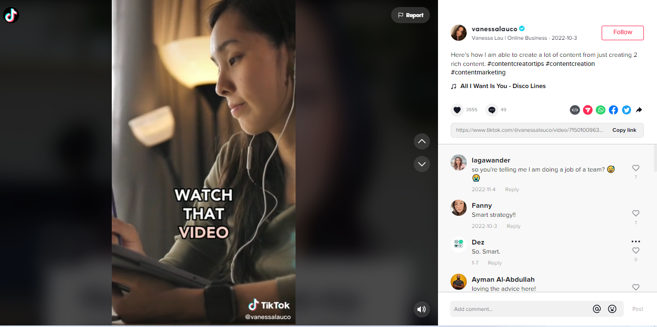 - User-generated content: Aim to repost relevant videos from your followers either on your TikTok account or other social platforms. This shows that you value their input.
