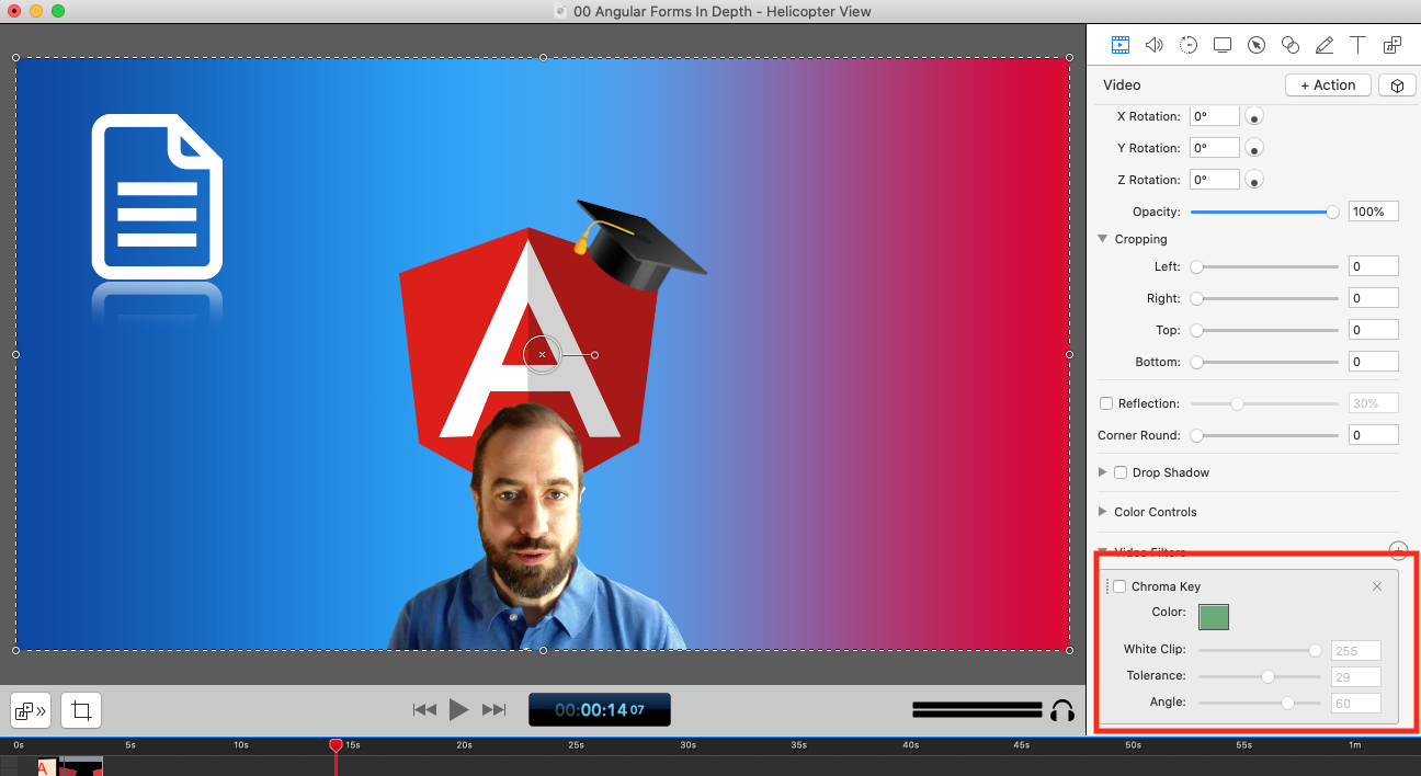 So we are essentially applying a color removal filter, it’s that simple! The color that will be removed is the green screen color (also known as the chroma key color), which is chosen because it’s just the color farthest away from all human skin tones.